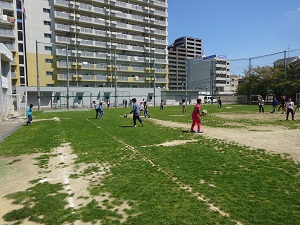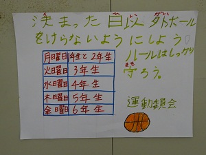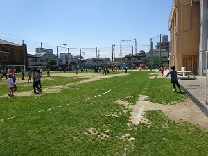 4月24日(月)ぽかぽか陽気の20分休み、子どもたちが元気に運動場でドッジボールやボールけり、鬼ごっこなどをしています。運動場でボールを蹴るにはルールがあって、学年ごとに曜日が決まっています。安全に楽しく遊べるようになっています。