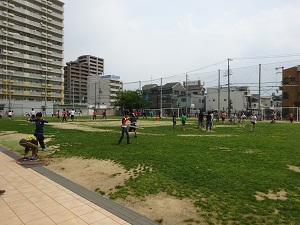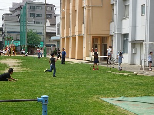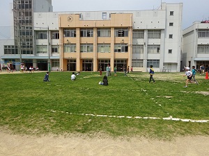 5月1日(月) 5月に入り暖かな気温の中、運動場では緑が少し濃くなった芝生の上に座っている子どもや竹馬を使って遊んでいる子どもたちがいました。また、フラフープを使って友達と楽しく遊んでいる子どもや一輪車で遊んでいる子どももいました。