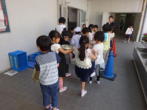 5月8日(月) 給食が終わったら、当番の人が食器を給食室に運んできます。給食室前で、声をそろえて「ごちそうさま」を言った後、それぞれの食器を決められた場所へ返します。牛乳びんは、給食室前のかごに返します。今日の肉じゃがもおいしくいただきました。