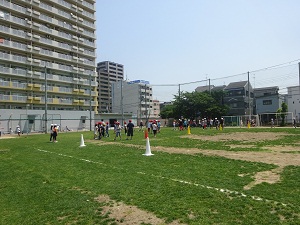 5月29日(月) 昨日の日曜日に地域の方々が、運動場中央部分の芝生が薄くなったところに、10cm四方の芝生ブロックをはっていただきました。はった部分は、しばらく養生することになります。子どもたちはそこを避けて、上手に遊んでいました。作業をしていただきました皆様、ありがとうございました。