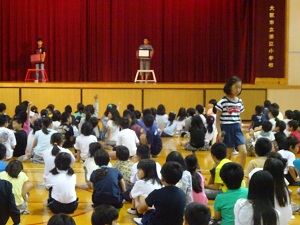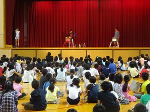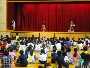6月8日(木) 今日の児童集会は、箱の中に何か入っているのはどちらかを当てるクイズでした。箱を持ち上げる様子で、赤か白の箱を予想します。元気に手をあげている人に集会委員会の人がマイクを向け、答えてもらいます。箱の中には、水筒がたくさん入っていました。