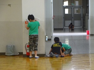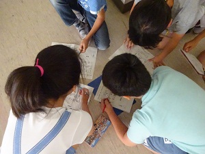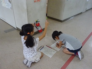 6月12日(月) 4年生が校舎配置図を持って、何やら書き込んでいます。学校の中にある防火施設を調べ、防火バケツや消化器、防火扉などを書いていました。友だちと協力してしっかり勉強していました。