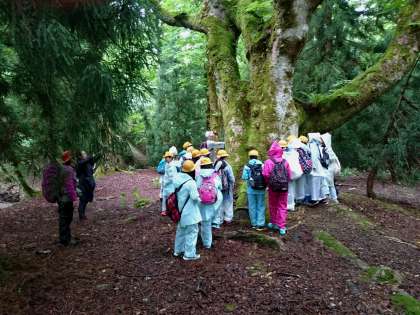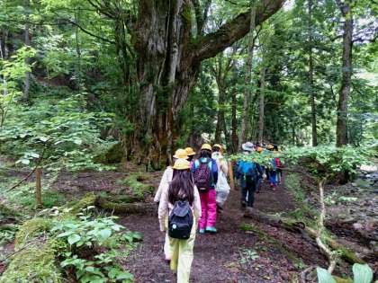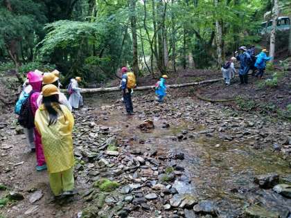朝から降っていた雨もほぼ止み、念のため雨具を着込んでの芦生の森ハイキングに出かけました。