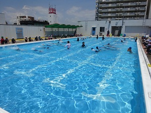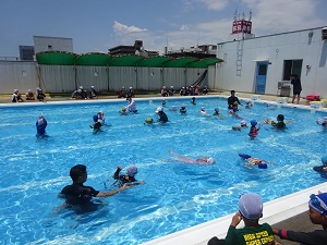 着衣泳を1・2年生も行いました。初めて服を着て水に入る子どもは、水中での動きにくさに驚いているようでした。また、プールサイドに上がるのにも一苦労していました。