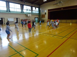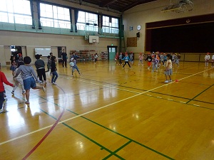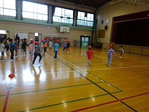 10月13日(金) 20分休み、2年生がドッジボールをして遊んでいました。運動場の芝生面は、オーバーシードをした後の養生期間になって使えません。それで、体育館を20分休みと昼休みに交代で使えるようにしています。2年生の元気な声が体育館に響いていました。