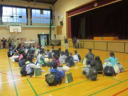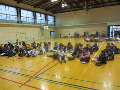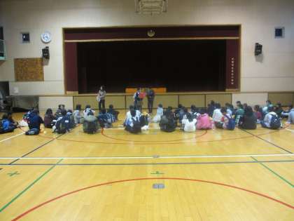 多くの保護者の方に見守られ、予定よりやや早く学校に到着しました。帰校式ではやや疲れ気味ながらも、話を聞くことができていました。