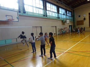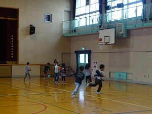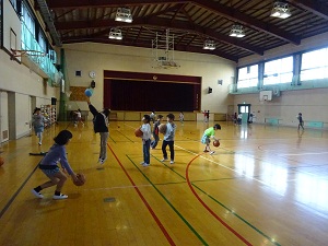 10月23日(月) 台風一過、外で遊ぶ人もいるので今日の体育館で遊ぶ人は少なめで、3年生はゆったりと遊ぶことができていました。バスケットのリングに向かってシュートの遊びを友だちとしていました。