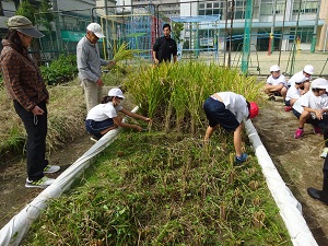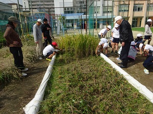 10月24日(火) 5年生が春に植えた苗が、立派に実って稲穂をたれるまでに育ちました。地域の方に教えてもらいながら、稲刈りをしました。鎌の扱いも2度3度するうちに慣れてきました。刈った稲は調理実習で食べるそうです。子どもたちから「楽しみ」と言う声が上がっていました。