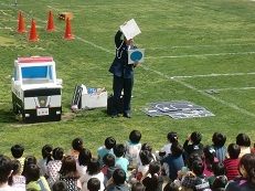 住之江警察署・交通安全課より3名のおまわりさんに講師としてお越しいただきました。初めに、ユーモアたっぷりで、しかも分かりやすい交通安全に関するお話があり、子どもたちは一生懸命聞いていました。クイズが出されたり、アシスタントを頼まれたりすると、多くの子どもが手を挙げ、おまわりさんも満面の笑顔で指名されていました。