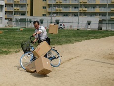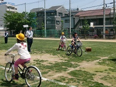 後半は、運動場に作られたコースを使って、低学年は歩行訓練を、高学年は自転車の正しい乗り方の訓練を実施しました。
