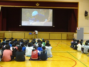 11月28日(火) 住之江警察署から警察官を招いて交通安全教室を行いました。低学年は、安全な歩行のDVDを見たりクイズ形式のお話を聞いたり、ボードを使っての歩行シュミレーションを見たりしました。