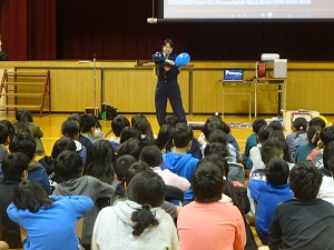 高学年は、自転車の安全なのりかたのDVDを見た後、ヘルメットをかぶることの大事なことを風船を使った実験を見たりしました。