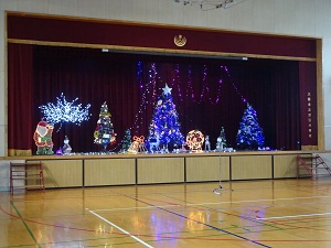 12月25日(月)2学期の終業式が行われました。みんなで校歌を歌い式は終わりました。その後、先日行われた地域行事「冬の肝だめし」で点灯されたイルミネーションを子どもたち全員で鑑賞しました。真っ暗な中、色とりどりのライトが点灯し点滅すると子どもたちから歓声が上がりました。このすてきなひと時のため、作成・保存していただきました地域の皆様に感謝いたします。2学期にもご協力ご支援いただきました保護者のの皆様・関係者の皆様、ありがとうございました。よいお年を。