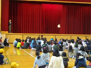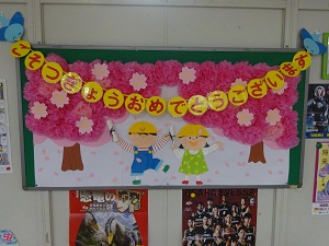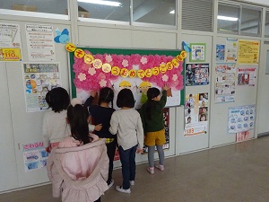 3月1日(木) 児童集会で飛んでるものを当てるゲームがありました。終えて体育館からの帰りに職員室前の掲示が3月のものに変わっていました。1年生が「かわいいー」と言って見入っていました。