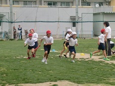 遊具や鉄棒等を使っての準備運動の後、1周100mのトラックを使ってリレーをしました。コーナーがきついですが、芝生の運動場では、思い切ってカーブを走りきる子どもが多く、土の運動場に比べて、1周あたり2〜3秒タイムが速くなる子どももいます。