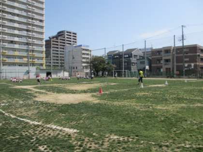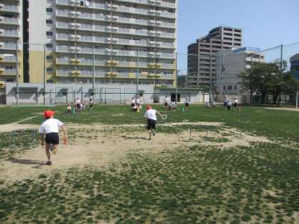 日差しもあり、とても暖かく、運動日和です。芝生の運動場では、4年生が元気に体育の授業を行っていました。