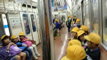 振っていた雨もやみ、雲の切れ目から日が差し込んできました。中学年は予定通り遠足に出発しています。写真は電車の中での様子です。とても静かに乗車しています。