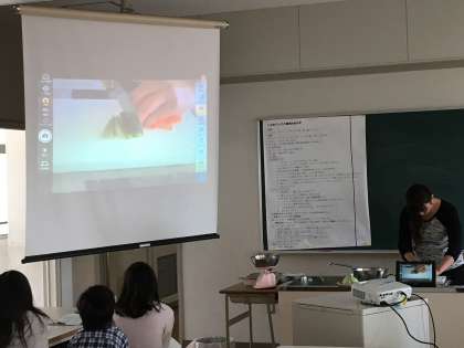 6年の家庭での調理実習での一コマです。担当の先生が、タブレットをカメラにして、スクリーンに調理の手本を映し出しています。ICT機器の導入により、今までできなかったことが、可能になり、より子どもにとってわかりやすい授業を進める努力をしていきます。