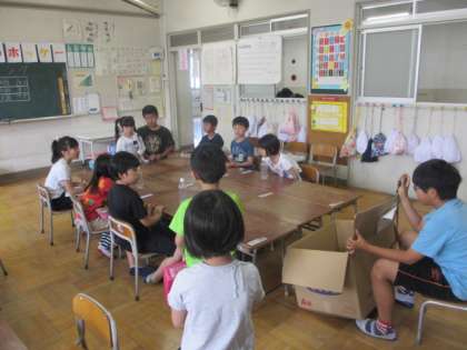 子どもたち全員が各クラスで作ったお店の店番をし、縦割りグループでお客さんとして、お店を巡りました。