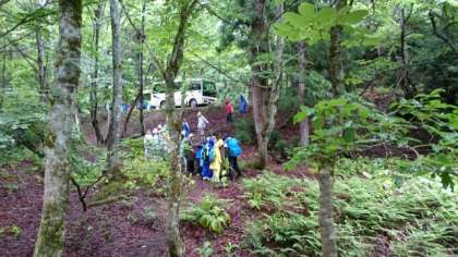 あいにくの雨の中ですが、レインコートをまとい、川を渡っていざ芦生の森へ。森の中は、降っている雨は木のおかげでさえぎられています。