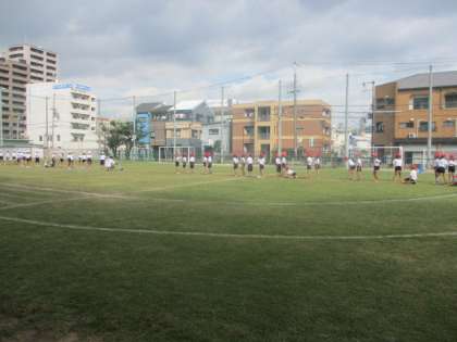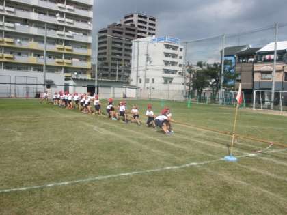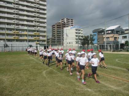 朝は雨模様でしたが、徐々に天気も回復し、昼からはよく晴れ、太陽が照らす芝生の上で、運動会の練習は進められています。