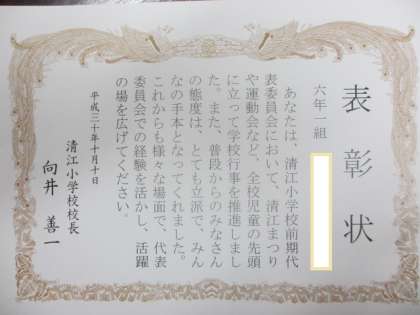 校長室で、平成30年度の前期児童会の代表委員会の子どもたちに、校長先生から表彰状が手渡されました。半年間、忙しかったと思います。お疲れ様でした。この経験を今後に生かしてほしいものです。