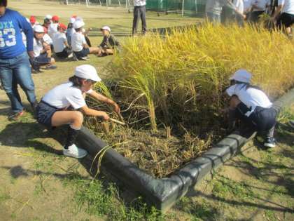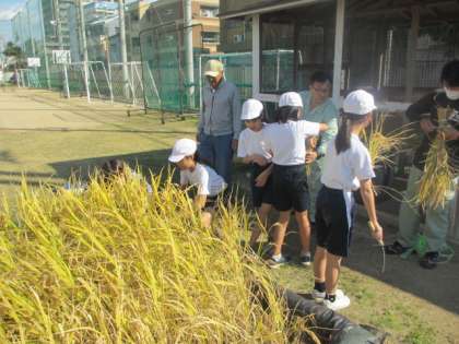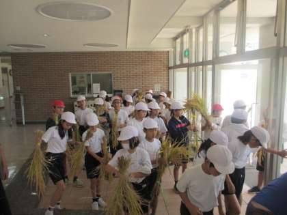 地域のみなさまの力をお借りして、5年生は本日、春に植えたお米を子どもたちの手で収穫しました。収穫した稲は、校舎内に、逆さにつるしています。ご協力ありがとうございました。