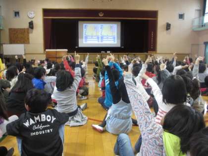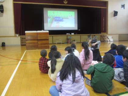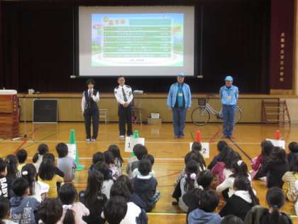 住之江警察署と区役所の交通安全見守り隊の方々にお越しいただき、交通安全教室を行いました。いつもの生活の中で潜む危険から身を守るため、映像や実演で学びました。しっかりと生かしてほしいと思います。