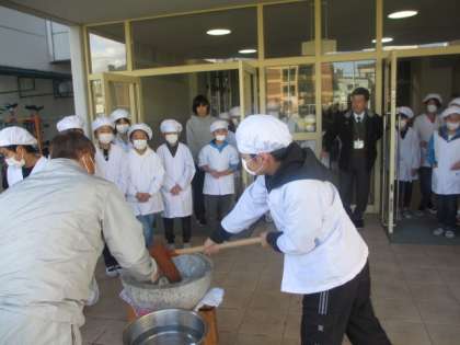 本日、はぐくみネットワークの協力で、5年生がもちつきを行いました。なかなかなれない杵で力強く???全員がつきました。