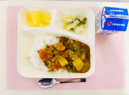 ビーフカレーライスは、毎回子どもたちに大人気の献立です。「やったー!カレーライス!」「今日はプールも入ったし(4年)、給食はカレーやし、最高やん!」と、喜んでくれていました。