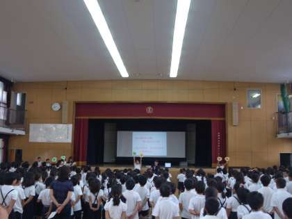 7月17日水曜日。本日の児童集会は音楽集会でした。「はじめの一歩」を歌いました。1・3・5年、2・4・6年で分かれて歌った後に全員で歌いました。歌詞に出てくる「ぼくらのゆめをなくしちゃいけない」にちなみ、多くの子どもたちに自分の夢も発表してもらいました。
