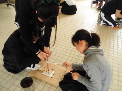 社会科の学習で大昔の暮らしの学習の中で、火おこし能力仕方を大阪ガスの方に来てもらい教えてもらいました。今では簡単に火をつけることができますがとても苦労して火を起こしていました。