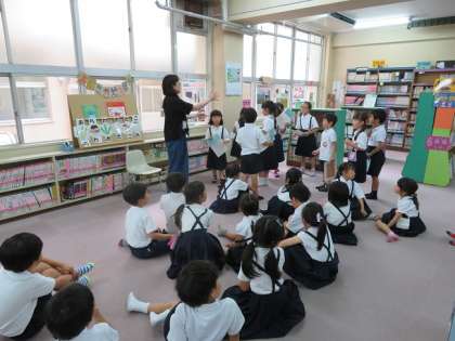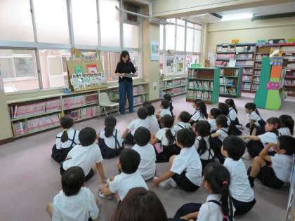 毎週火曜日と金曜日に来て下さる図書館司書の竹谷先生が1年に読み聞かせをしてくださいました。そのあと絵本に出てきたしり取りをして遊びました。1年生だけでなく全部の学年に読み聞かせや図鑑の使い方などを教えてくださっています。竹谷先生は住吉区の区の教育事業の一環として昨年度から東粉浜小学校に来ていただいています。