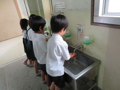 今年は梅雨入りが遅いですが、梅雨になると食中毒が増えてきます。給食室では調理員さんたちがしっかり衛生管理をして給食を作ってくれています。自分たちでもしっかりと手を洗い食中毒を防ごうと呼びかけています。