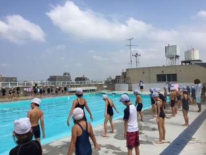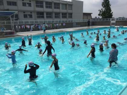 プール開放が始まりました。高学年は泳力別で練習し、低学年は音楽に合わせて準備体操や水慣れをしてした後ゲームをして楽しみました。