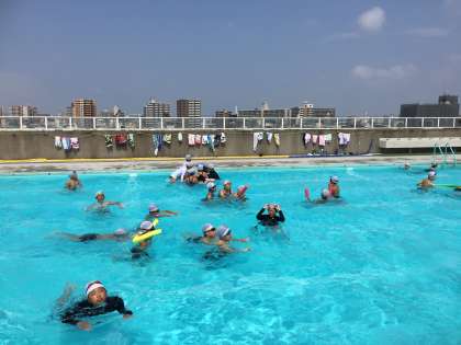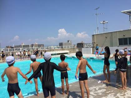 プール開放が始まりました。昨日は雨のため中止になりました。しかし、今日は晴天、プール日和です。準備体操、水慣れ、泳ぎの練習、自由練習とっても気持ちがいいです。