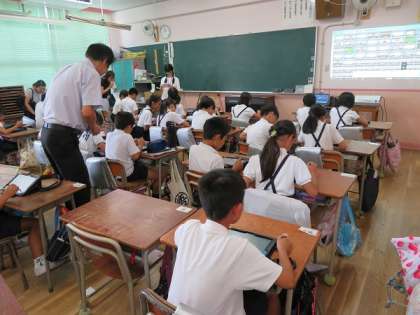 4年生は1組はタブレットを使って調べ学習をまとめていきました。2組はバイオリンとチェロの生演奏を聴き最後には子どもたち歌でコラボしました。1組は4時間目にしました。