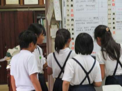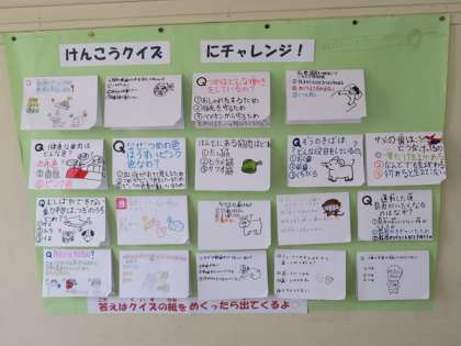 保健委員会では、毎週火曜日にハンカチ・ティッシュ・ブクブクうがい調べをし、水曜日のお昼の放送でよくできていたクラスを発表しています。続けることで子どもたちの清潔にしようとする意識が高まってきています。また、委員会の時間に作った「けんこうクイズ」を掲示しみんなの健康への意識を高めようと頑張っています。
