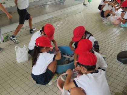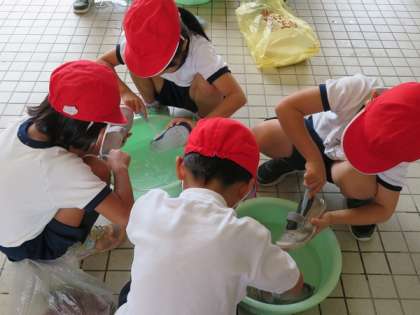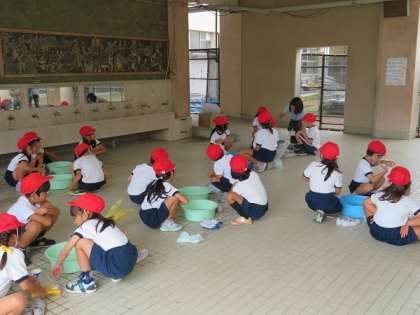 1年生が上靴を洗う体験をしました。たらいに洗剤を入れ、歯ブラシを使ってゴシゴシ汚れを落としました。きれいになった靴を自慢げに見せていました。また一つでいることが増えました。家でもさせてみてください。