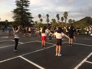 朝の集い。みんな元気よく目覚めラジオ体操をしました。そしてホテルをバックに学年全員で写真を撮りました。