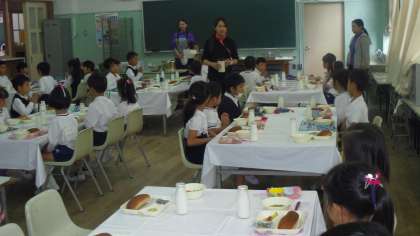 10月17日に東粉浜幼稚園の子どもたちと1年生が、一緒に給食を食べました。幼稚園の子どもたちは、学校給食を食べるのが初めということでしたが、大きいパンや、温かいおかずのおいしさにとても嬉しそうにしていました。てきぱきと準備や配膳をしている1年生を見ていた園児たちは、その姿に頼もしさを感じている様子でした。