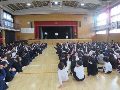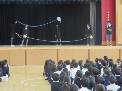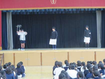 保健委員会の児童がインフルエンザや風邪の予防についてクイズやコントで紹介してくれました。くしゃみは5m以上飛び、その中にいる菌はしばらく生きているそうです。また、目をこすったり鼻を触ったり指を口に入れたりすると感染してしまうことも楽しく教えてくれました。まだまだ、インフルエンザは猛威を振るっています手洗いうがいはもちろん、睡眠を十分にとって体を休めることも大切です。病気にならないよう十分に気を付けましょう。