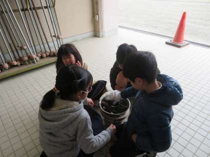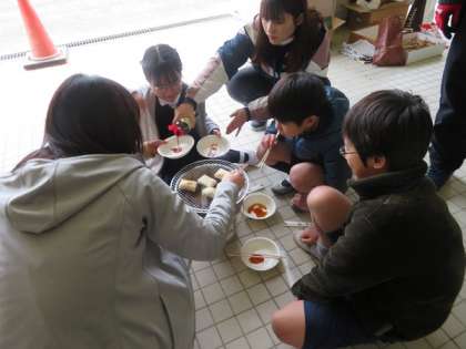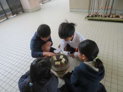 3年生が会科で昔の暮らしの学習をしています。今日は七輪で火を起こしお餅を焼いて食べました。七輪に新聞紙を丸めて入れ、木切れを入れ、火をつけます。今度は炭を入れます。暫くすると炎がおさまり隅が赤々としてきます。そしていよいよ網を七輪の上に置いてお餅を焼きます。お餅はまだかなまだかなと何度もひっくり返すと真っ黒に焦げずにおいしく焼くことができます。焼けたお餅に醤油をにけて食べました。ほんのり焦げ目がついてとてもおいしかったです。