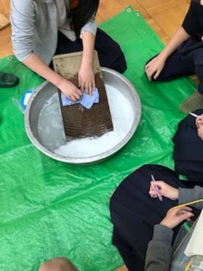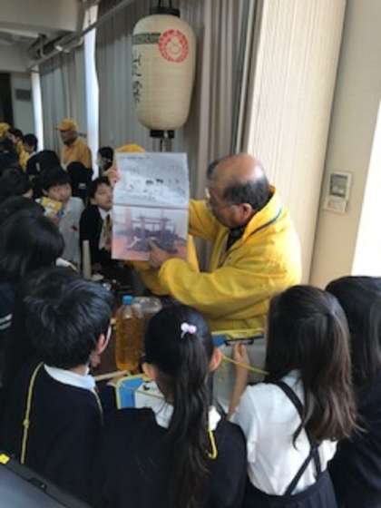 先日の七輪体験に続いて昔のいろいろな道具の使い方などを学習しました。住吉歴史案内人の会の人たちにゲストティチャーとして来ていただきました。糸車や七輪、火鉢、たらいや洗濯板などの道具について説明をしていただきました。各コーナーに分かれて見学しました実演をしてもらったりもしました。子どもたちはとても興味深く見て触っていました。
