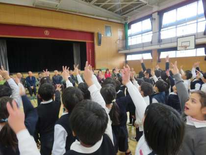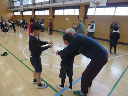 遊びを教えていただきました。こま、けん玉、あやとり、羽つき、おはじきなど教えてもらいました。なかなかうまくいかなくて当たり前です。今日はしっかり教えてもらって、今後は繰り返し練習したいと思います。できるまで繰り返し練習することで子ども達には達成感や成就感を味わわせるとともに粘り強さが身につくと思います。お礼に「にじ」の歌を歌いました。