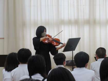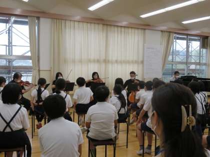 5年生が弦楽四重奏のを鑑賞しました。プロの演奏家の方に来ていただいて、生の演奏を聴きましたひとつずつの楽器の音を聞いた後演奏を聴きました。また、一つず楽器を増やして聞くことでそれぞれの楽器の役割を知ることができました。保護者の方にも来ていただきました。今年度はなかなか学習参観も持ちにくい状況です。1学級ずつ行う鑑賞会にぜひお越しください。