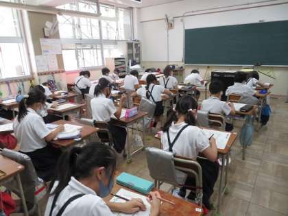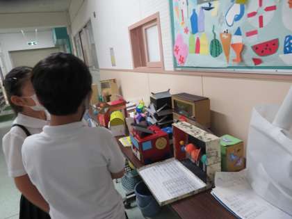 今年は始業式の日から4時間授業、そして給食があります。教室の様子をのぞいてみると、夏休みの作品の発表会や、音読カードなどの2学期の学習の準備、2学期の目当てを決めているクラス、本格的に授業を進めるクラスなど様々でした。休憩時間には、友達の作品を仲良く見ている姿も見られました。