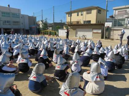 住吉消防署の方にお越しいただき、火災避難訓練をしました。避難は全員防災頭巾をかぶり静かに避難できました。消防署の方からは「とても立派でした」とほめていただきました。いつ起こるかわからない災害のために、自分の命、友だちの命を守ることができるように普段から意識していきたいです。