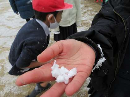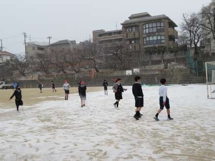 大阪に雪が降りました、子どもたちは大喜びで運動場に出て走り回っていました。低学年は下校した後だったので残念ながら遊ぶことはできませんでした。うっすらと運動場に雪が積もりました。校舎の陰になるところだけに雪が積もっていました。雪だるまができるほどではありませんでしたが子どもたちは大喜びでした。