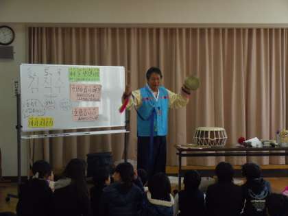 2月16日の4年生が民族講師(ソンセンニㇺ)をお招きして授業をしていただきました。民族衣装のチマ・チョゴリを着せていただいたり、楽器を教えていただいたり、日本のこまにあたるぺインを体験したり、子どもたちは、習慣や文化の違いを楽しく学習しました。